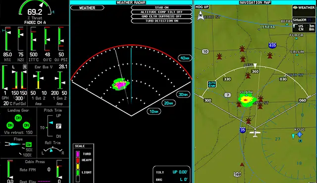 Auto Radar powered by the Vision Jet’s Perspective Touch+ avionics, allows the pilot to select the desired radar range which then automatically scans the area ahead and displays a composite, real-time depiction of the weather. The Auto Radar system works to create more than a “sliced image” of the weather ahead. The imagery is clearer than ever with a 16-color palette and improved automatic ground-clutter suppression.